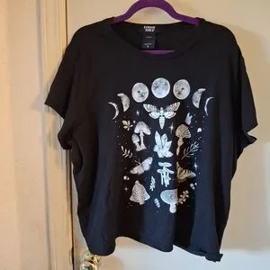 Black tee featuring a moon and mushroom graphic design. Perfect for casual wear.