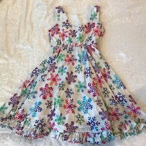 This vibrant kids dress features a playful snowflake pattern in multiple colors, perfect for any festive occasion. The sleeveless design ensures comfort and style.