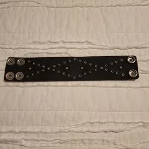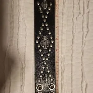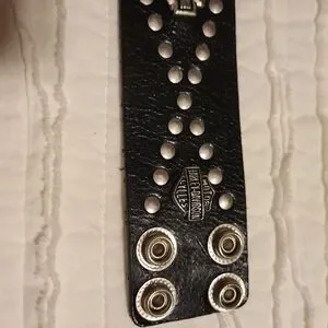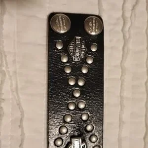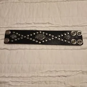 Black leather bracelet with silver studs and Harley-Davidson logo.