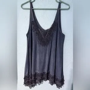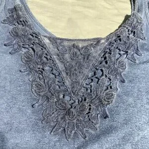 Elegant acid washed blue tank top with delicate lace accents. Ideal for versatile styling. Longer length looks nice with leggings.