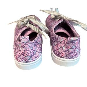 super cute metallic silver laces! Canvas sneaker with an allover purple pink and blue mermaid scales print