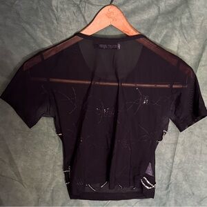 Italian niche designer Discount Universe sheer statement tee. Featuring intricate barbed wire sequin embellishments, it's perfect for a night out, concert, or photoshoot.
