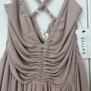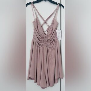 Elegant mauve romper in rib. Features a ruched bodice. Sleeveless design. Perfect for any occasion.