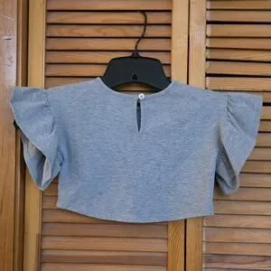 excellent condition, sequined heart with bow design on front, short ruffle sleeves, crewneck, 62% polyester, 33% cotton, 5% spandex