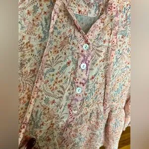 Chic floral blouse with a soft pink and orange palette. Perfect for casual outings.