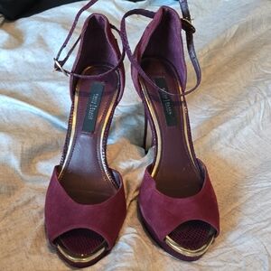 Chic burgundy heels with peep-toe design. Features ankle strap for secure fit. Ideal for elegant outings.