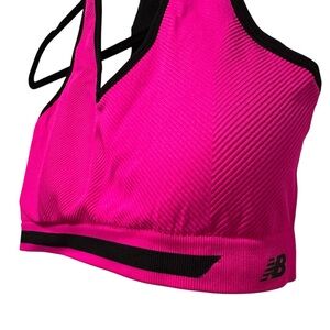 Experience comfort and style with this vibrant pink and black New Balance sports bra. Size large with removable padding and a soft, stretchy blend (97% nylon, 3% spandex). Perfect for workouts or casual wear. Gently used, good condition.