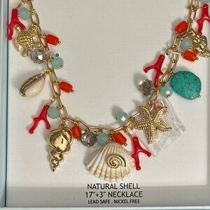 Chic gold necklace with vibrant gold, red and turquoise charms. Features a natural shell, red coral, turquoise stone, sea turtle, puka shell and starfish accents. Perfect for adding flair to any outfit.