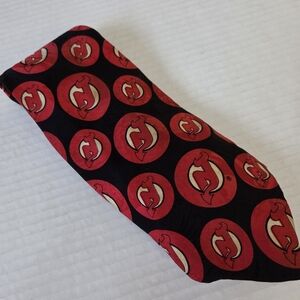 The product is a men's neck tie from the brand RM Sport, featuring a multicolor design with a sport theme. Made of silk fabric in a jersey style, this official NHL Hockey fan accessory is proudly manufactured in the United States. Perfect for supporters of the New Jersey Devils, this tie is a stylish and unique addition to any hockey fan's wardrobe.