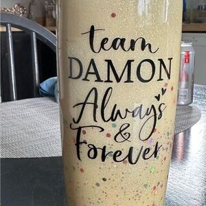 Sparkling off white tumbler with 'Team Damon Always & Forever' design. Perfect for TVD fans.