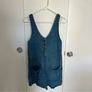Casual denim jumpsuit. Features button front. Sleeveless with pockets.
