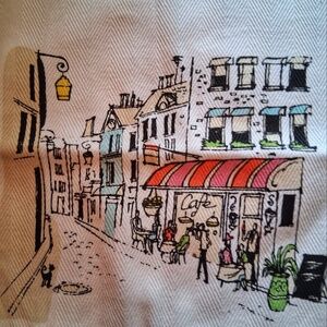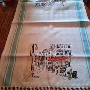 Vintage fringe kitchen towel. Cotton, larger, white background, teal stripes on the side, street cafe scene on the center, and fringe on the hem. Like new condition!