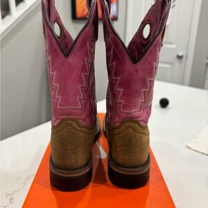 Chic Shyanne boots in pink with brown accents. Features detailed stitching. Worn twice