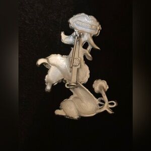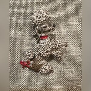 Vintage poodle brooch signed Gerry’s. Textured enamel resembling spaghetti fur, referred to as”Spaghetti Poodle” brooch. Silver-tone brooch in shade of gray and black with red accent collar and bow. Great vintage condition. Push back pin is functional.