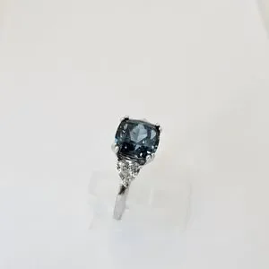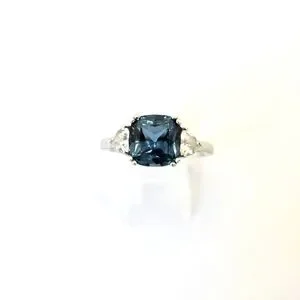 Incredible vintage ring with a large square London blue topaz with white topaz on each side. The band is solid sterling silver with rhodium overlay. That will prevent tarnishing and protect the shine for many years of wear. The ring is in excellent condition. Size 9.5