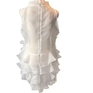 Elevate your wardrobe with this showstopping white organza Hi-Lo top from FT Inc. Featuring an elegant high neck and cascading tiered ruffles, this sleeveless blouse is adorned with a dramatic oversized rosette at the chest, adding a stunning sculptural element. The sheer back zips up for a flattering fit, while the lightweight layered design flows beautifully.
