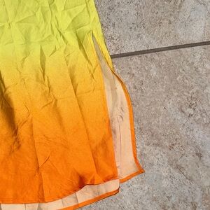 This stunning dress features a beautiful gradient of pink, yellow, and orange, perfect for any occasion. The spaghetti straps add a touch of elegance and comfort.