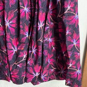 the Caprice Dress is cut from our signature printed poplin with surreal magenta and hyacinth-hued blooms against a swirling background. This dress features bubble hemmed sleeves and neckline, wide ruched straps, and muti-arched seams along the midi-length skirt.