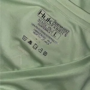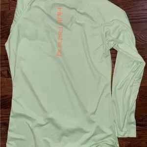 Light green long sleeve tee with orange Huk logo. Ideal for fishing and outdoor activities. Comfortable and stylish design.