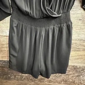 Elegant black romper. Features flowing sleeves. Perfect for any occasion.