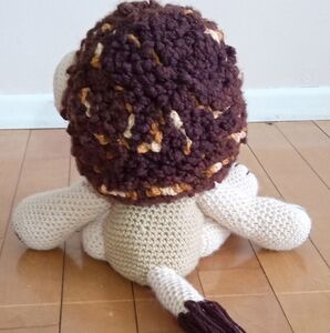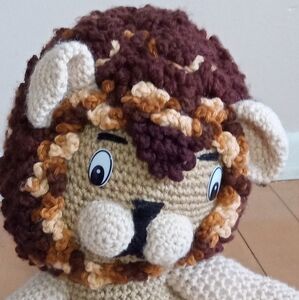 Adorable handmade crochet lion plush toy. Crocheted with love and attention to detail. From the curly mane, hanging tail fur, details on the face and cupped ears. Make this a one of a kind plushie for collectors. You won't find another one like it! Perfect for kids' playtime and cuddling. Approximately 15" tall, 14" from arm to arm, head is 8" wide, 10" wide from foot to foot. Excellent pre-owned condition with one flawed stitch, not noticeable.