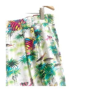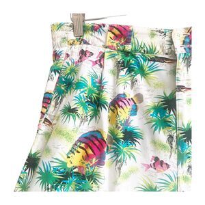 The Gap Tropical Lightweight Trousers are perfect for travel, parties, or casual wear. Made of lightweight rayon material, these relaxed-fit pants feature a tapered leg and a high-rise waist size of 35 inches. The colorful, tropical pattern and cropped style make them a fun addition to any wardrobe. The trousers have a zip and button closure and are available in size large.