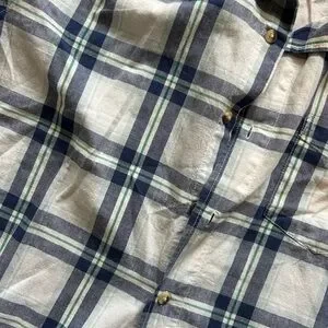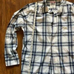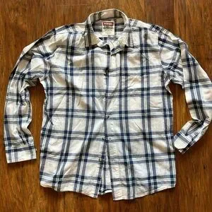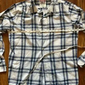 This Wrangler shirt features a classic blue and white plaid pattern, perfect for casual outings. Crafted from lightweight fabric, it offers comfort and style with its timeless button-down design.