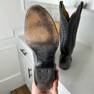 Own a piece of Western luxury with these rare Tony Lama El Rey Collection boots in women’s size 7C. Handcrafted in the USA, these boots feature full-quill ostrich leather vamps and premium black leather shafts with stunning blue and silver embroidery. The El Rey line is highly sought after by collectors for its craftsmanship and timeless design.