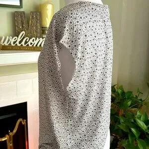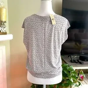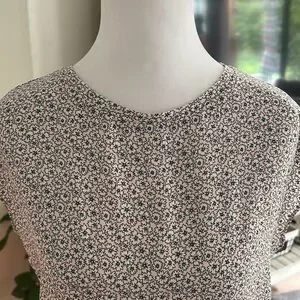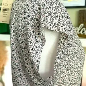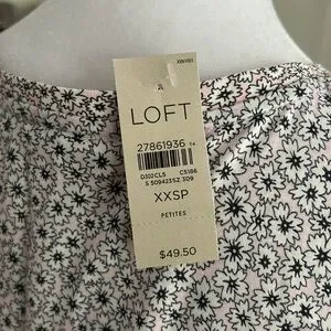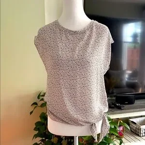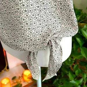 Elegant floral blouse with a tie detail. Soft pink and white pattern. Ideal for versatile styling.