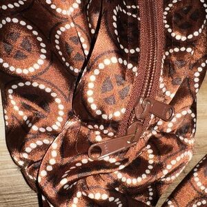 Super unique brown patterned satin yoga adjustable sling/carrier. Tie is adjustable for length. 100% Polyester. Fully lined. Additional space for mat cleaner, towels, etc.
