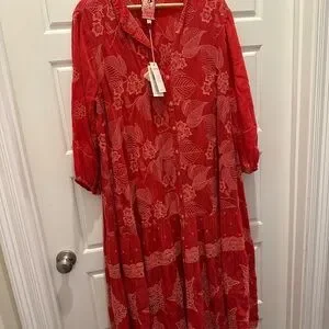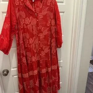 Chic red midi dress with floral patterns. Features three-quarter sleeves and a flowing silhouette. Ideal for stylish outings. 2 piece