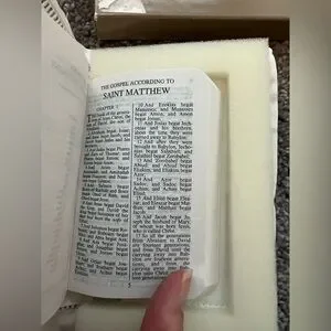• The Bible itself has a white, decorated cover, made of cotton with lace trim, and embroidered