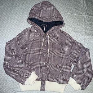 Chic plaid bomber jacket with a cozy hood. Snap front closure. Ribbed cuffs and hem. Ideal for cool weather.