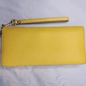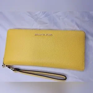 Stylish Michael Kors wallet. Vibrant yellow color. Features wrist strap. Elegant design.