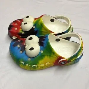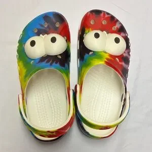 Bright and playful crocs featuring a vibrant tie-dye design and fun eye details. Perfect for adding a splash of color to any outfit.