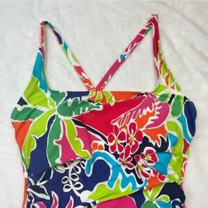 beautiful colorful jungle colorblock style with abstract geometric tropical florals, adjustable straps with cross cross style in back, low cut open back, stretchy swim material, built in padding,