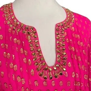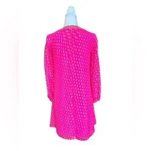 Hot pink and gold Colby long sleeve tunic dress by Lilly Pulitzer. U-neckline with embellishments. Silk. Size 2. New without tags. 18” pit to pit. Lined except sleeves.