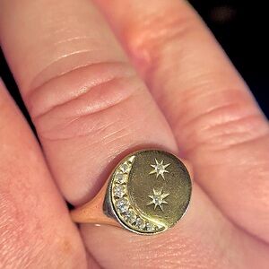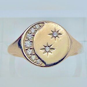 A beautiful coin signet ring. Celestial crescent moon & two stars are pave flush set within the setting