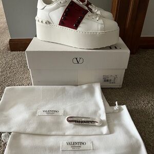 Valentino Garavani rockstud platform sneakers. White with red accent. Ruthenium studded hardware. Lace up. These are stock photos. I will include the actual photos later today. Size 39. Brand new with box, 2 dustbags, and extra laces. All sales final.
