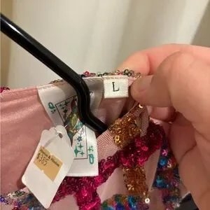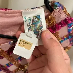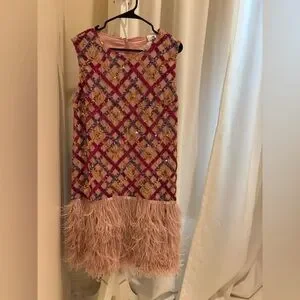 QUEEN OF SPARKLES dress!! Diamond feather dress! New with tags & originally $385. This dress is absolutely gorgeous, it’s just too big on me. Size large. Vibrant plaid dress with pink and blue pattern. Features a playful feather hem. Sleeveless design.