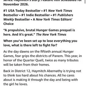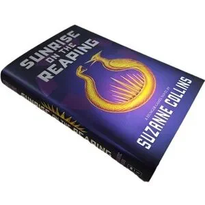 Hardcover book titled 'Sunrise on the Reaping' by Suzanne Collins. Features a striking purple cover with a gold emblem.