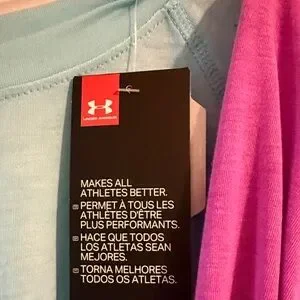 Under Armour long sleeve tops in aqua and magenta. Soft fabric. Ideal for layering or casual wear. Perfect for lounging or workouts, whatever your pastime. Soft and comfy, open back for style. Brand new one still with tags ,two for price of one. Originally priced more but purchased price at $32 each. A bargain! Both size medium.