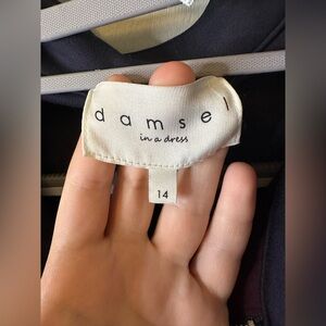 Elegant label from Damsel In A Dress. Features brand name and size.