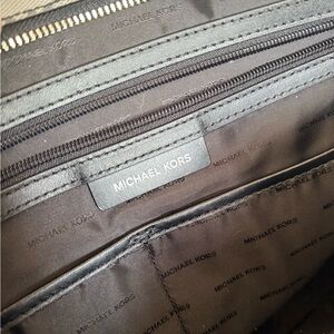 Stylish Michael Kors tote with iconic MK pattern. Black handles and trim. Perfect for everyday elegance.only a few tiny flaws. As pictured on bottom of purse. See pictures for measurements