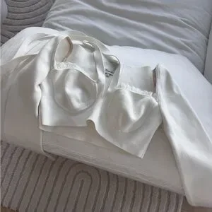 So cute XS but can also fit a small or medium. Has stretch. Thick and flattering material. You can tie the strings to a bow or knot in front or criss cross around - versatile top! Ruffle crop top with tie - worn one time