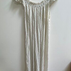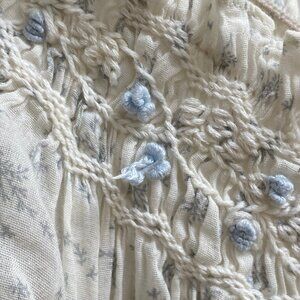 Gorgeous Doen Nightgown White with light blue floral pattern and smocked neck with embroidery. Lightly worn. When taking photos I noticed two spots with discoloration. Nearly imperceptible. pictures in last two photos. I imagine they would fade or wash out if treated and put in the sun. A couple of the embroidered blue rosettes have come undone, the threads are not broken, however. Very wearable. Only hand washed and air dried. From a smoke and pet-free household.