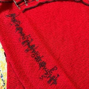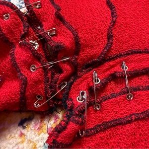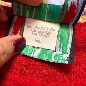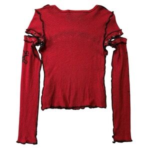 Turn heads with this ultra-rare vintage Y2K Lip Service long sleeve top! A killer piece straight out of the early 2000s alternative scene, this blood-red mesh knit features bold black exposed seams, sleeve graphics, and intense safety pin hardware across the bust and sleeves for that rebellious DIY punk vibe. Distressed lettuce trim hem adds that perfect touch of grunge edge.