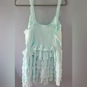 Adorable mint green dress with ruffle layers. Eyelet details add charm. Perfect for casual outings.