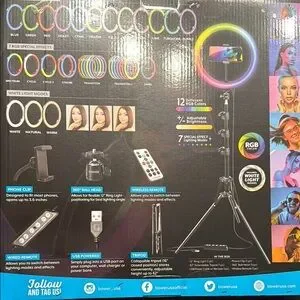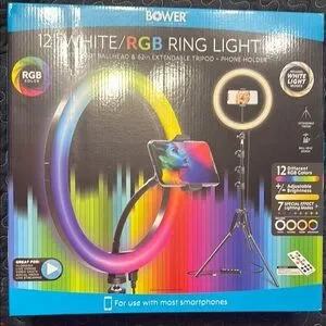 Bower RGB ring light with adjustable tripod and phone holder. Features 12 RGB colors and special effects lighting.