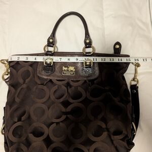 Stylish Coach shoulder bag with signature pattern. Dark brown hue. Perfect for everyday use. EUC